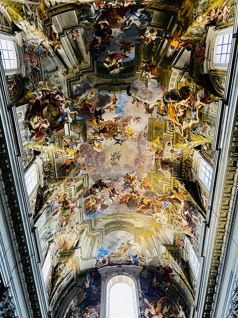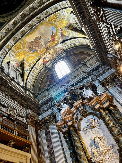 Today, on the way back from Campo de’ Fiori, we took a path I hadn’t before and stumbled upon a previously unseen cathedral. Chiesa di Sant’Ignazio di Loyola — dedicated to the founder of theJesuit Order — was breathtaking, and included some of the most beautiful frescoes I’ve ever seen. The illusionistic perspective of Andrea Pozzo’s trompe-l’œil dome, I read there, set the standard for the Late Baroque ceiling frescos for several generations throughout Europe.